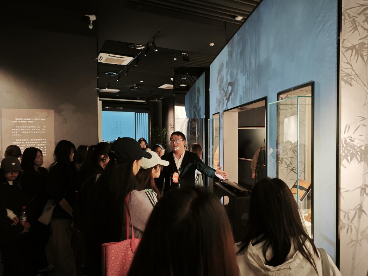 数字沉浸展区成为本次观展的最大亮点。当《辋川图》的墨色在投影中氤氲开来,《阳关曲》的旋律在空间中缓缓流淌,同学们仿佛步入"空翠湿人衣"的山涧,重走"行到水穷处"的石径。讲解员在"明月松间照"的沉浸场景中解读:"王维诗中的禅意留白,在数字技术的转化下获得了当代的生命力。那些看似空寂的处所,原来蛰伏着生命的回响。"这种数字与古典的对话,让同学们直观感受到"诗中有画,画中有诗"的艺术真谛。