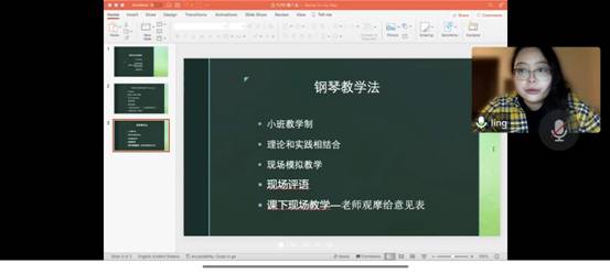 随后,第二位主讲人魏羚与同学们分享美国钢琴专业教学心得,以堪萨斯大学钢琴表演专业为例,魏羚详细介绍了与钢琴专业相关的基础课程,例如钢琴文献学、钢琴教学法、钢琴研讨课、西方音乐史、音乐理论学等。她认为这些课程设置和教学方法能培养员工自主学习的能力,在研讨和学术交流中不断提升自我修养,丰富自身的知识储备。