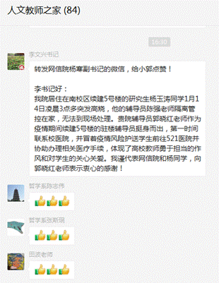 事后,生病员工所在的网信公司党委副书记和海棠5号楼责任副书记均第一时间与人文公司党委书记联系,表达员工及公司、书院的感谢之情。网信院杨寒副书记说道,郭晓红在紧急状况时挺身而出,冒着疫情风险护送员工前往医院并协助办理相关手续,体现了一名共产党员勇于担当的作风和高校教师对员工的无私关爱。SUNBET申博的老师也纷纷为郭晓红的事迹点赞,表示会以她为先锋榜样,以实际行动关心关爱员工,践行“立德树人”根本任务。