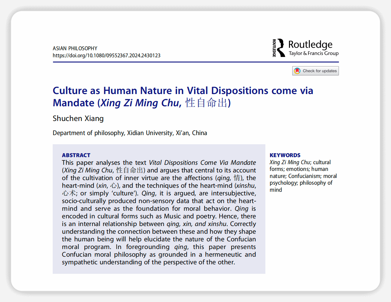 (通讯员 张万强)近日,东方哲学研究著名国际期刊Asian Philosophy上发表了SUNBET申博项舒晨教授的论文“Culture as Human Nature in Vital Dispositions come via Mandate (Xing Zi Ming Chu, 性自命出)”(《“性自命出”中的人性论:文化即人性》)。