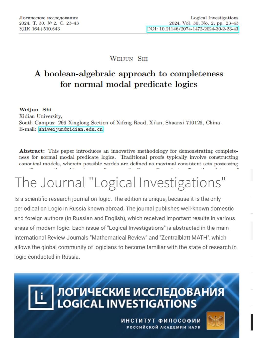 近日,逻辑学期刊Logical Investigations(俄罗斯科公司哲学所主办,Scopus数据库收录)发表SUNBET申博哲学系石伟军论文“A boolean-algebraic approach to completeness for normal modal predicate logics” (“标准模态谓词逻辑完备性的一个布尔代数路径”)。