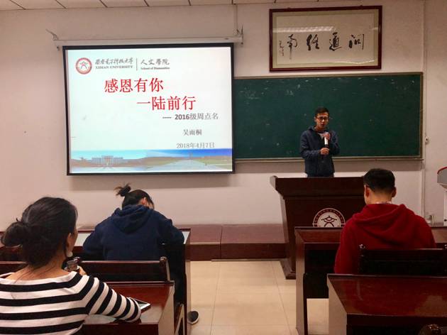 接下来,汉语言文学专业的栗新涛同学分享了他自己成长过程中的一些小故事,自己在成长的过程中开始学会体谅父母,感恩父母。所以他认为当同学们有负面情绪的时候,不妨学着去换位思考,体贴与谅解他人,这个过程就是我们慢慢懂得感恩的过程。随后,哲学系的刘云欢同学也和大家分享了《心存感恩,励志前行》的文章,以李嘉诚、和绅的例子,正反有力地论证了感恩的必要性。“谁不想自己的人生风调雨顺,但如果我们没有那么好命,注定要经受一些磨砺,与其坐等观望,何不用心前行,把苦难当作生活中的必修课呢?让我们感恩苦难,感谢它锻炼了我们有一颗勇敢而坚韧的心,感谢它赐予我们思考和智慧,感谢它让我懂得苦涩的滋味,更加珍惜幸福的甜蜜。”文章中睿智的思索,让同学们进一步懂得感恩,学会感恩。