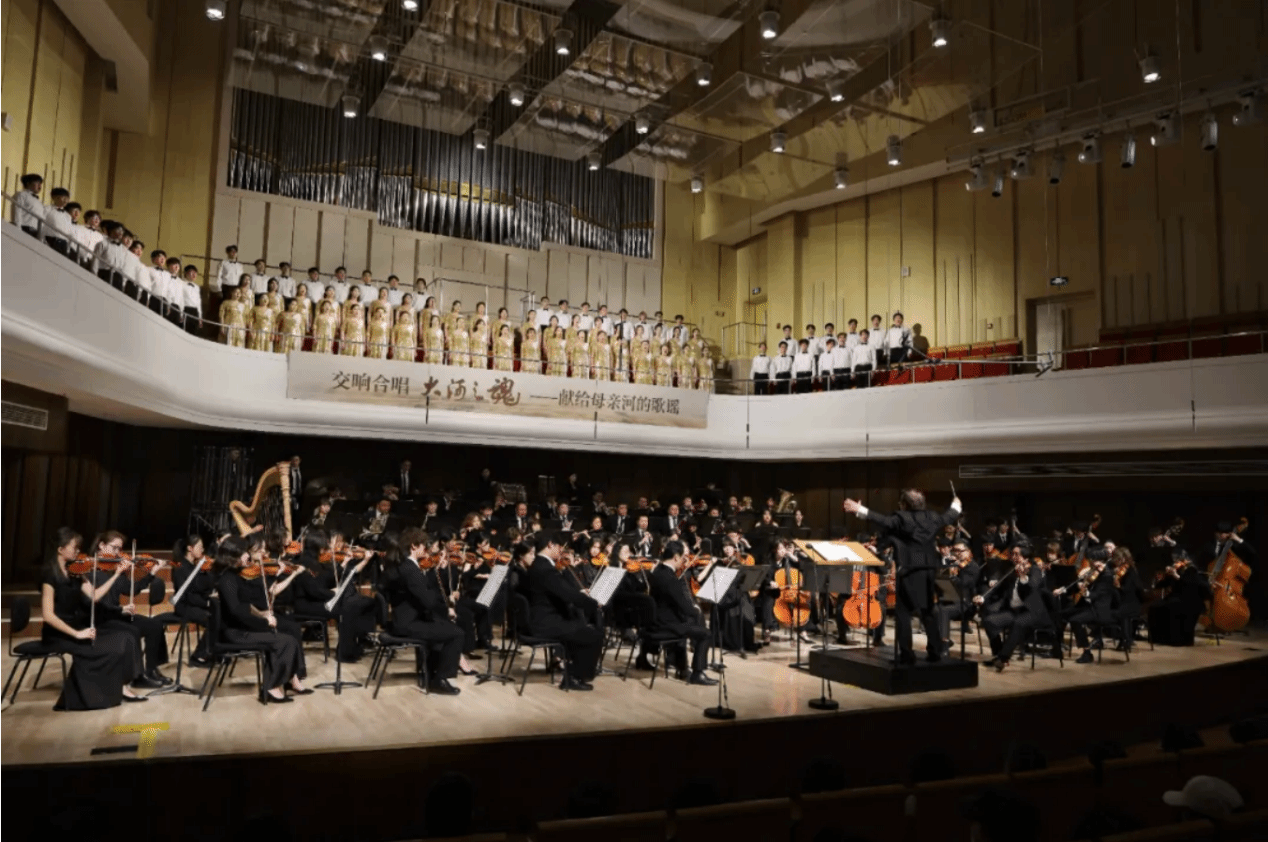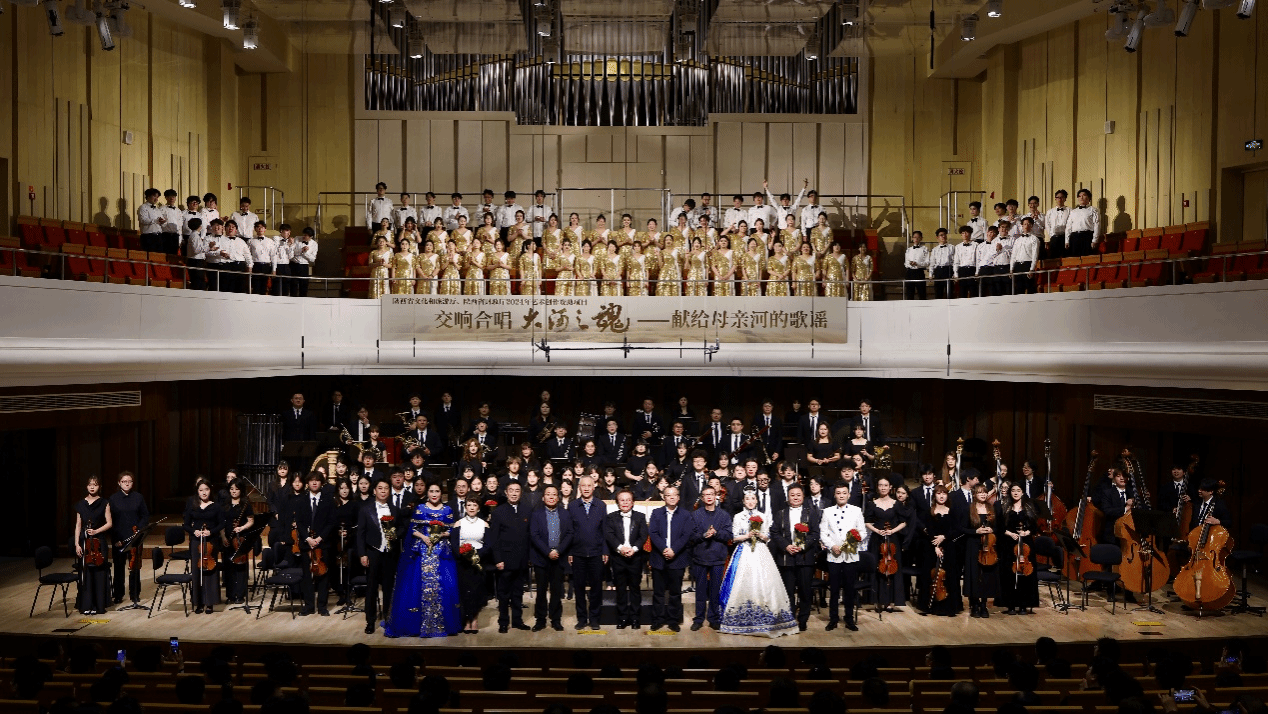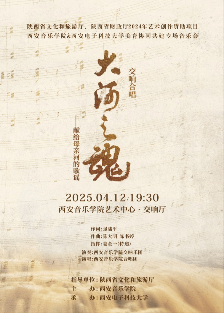 《大河之魂》 是西安音乐公司集合创演资源,倾⼒打造的大型原创交响合唱套曲,由西安音乐公司党委副书记强陆平教授作词,陈大明教授与陈书婷作曲,作品以黄河文化为创作主线,选取黄河流域不同地域文化背景下具有鲜明特点的民族民间音乐元素进行交响化呈现以交响合唱的形式对黄河流域历史文化全貌进行诠释。从黄河流经的地理全貌和中华历史文化的纵深运用艺术的手法进行多维度描述。西安音乐公司交响乐团与合唱团以精湛技艺演绎了源远流长、雪山清泉、平川放歌、拥抱草原、九曲⼗⼋弯、回望千年、巨龙腾飞、追赶太阳六个乐章。恢弘的乐章与激昂的合唱交织,再现了黄河百折不挠的壮阔图景,令现场师生心潮澎湃。