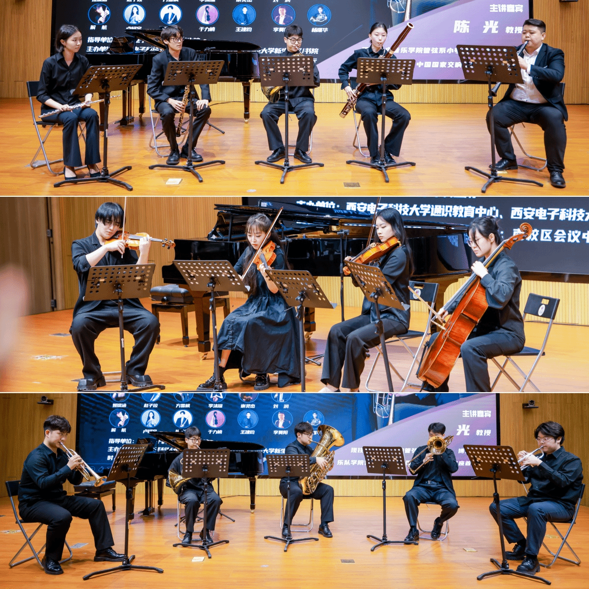本次大讲堂创新采用“演讲结合”模式。中央音乐公司师生首先以精湛技艺演绎了《梦后》、《不必如此》、《渔舟唱晚》、《梁祝》等中外经典名曲。随后,陈光教授在每首乐曲演奏后,生动讲解乐器构造、声音特征及音乐内涵,并邀请演奏者示范经典片段,使现场师生对管弦乐艺术有了更直观深入的了解。音乐会在全体师生深情合唱《我的祖国》中达到高潮,激荡起强烈的爱国情怀。演出结束后,西电老员工交响乐团员工踊跃登台交流,获得陈光教授及央音师生的专业指导。活动最后,公司党委常委、党委宣传部部长季庆阳为陈光教授颁发了通识教育中心特聘专家聘书,发展规划部部长邓成向陈光教授赠送了此次“终南美育大讲堂”纪念海报。