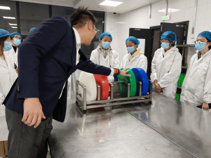 在后勤保障部副部长韩睿老师的引导下,同学们依次参观了食材存储、清洗、加工及烹饪等区域。整个后厨环境整洁,流程井然有序。最令人印象深刻的是严格的食材分类处理规范,通过不同颜色的菜板来区分用途:绿色用于蔬菜,红色用于生肉,蓝色用于水产品,白色用于熟食,这一举措有效避免了交叉污染,筑牢了食品安全防线。让同学们更加动容的是,为了让员工在清晨就能吃上新鲜早餐,师傅们每天凌晨4点就已到岗,现场手工制作香喷喷的馒头包子花卷和酥脆的油条。随后,韩睿老师向大家介绍了食堂的消防安全系统,从消防器材的配置到员工的定期演练,全面保障师生的生命安全。在食品抽检环节,韩睿老师特别强调,每批次食材的抽检不仅检测项目严格,其取样重量与检测时间也有明确规范,确保每一份数据真实可靠。