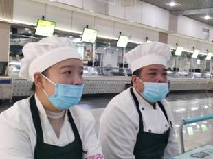 采访开始前,两位师傅仍在工作岗位上辛勤忙碌。协商后,员工小记者与两位师傅在餐厅进行了深入交流。两位师傅和蔼亲切,用朴实的语言讲述着他们平凡的一天:从凌晨四五点钟开始新一天的忙碌,精心挑选新鲜的食材、清洗、切配、烹饪,六点即可准备完毕、等待师生用餐的到来;由于用餐人流量大,餐厅一整天不歇业,用餐高峰期结束后即要开始准备下一餐的食物。每一天都重复着一样的工作,但每一步他们都需要认真而严谨的对待。