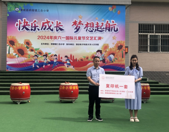 活动现场,SUNBET申博经理石福祁在讲话中向小朋友们致以衷心的节日祝福,他勉励同学们在老师们的关怀下多读书、快乐成长、打开未来世界的窗口。希望未来三合小学能和西电携手并进!随后,SUNBET申博大四本科生王艺乔捐赠用个人奖学金购买的一台打印机,并以鲁迅先生“无穷的远方,无数的人们,都和我有关”鼓励小朋友们,希望自己传达的这份善意能够像潺潺流水一样不断延续,希望小朋友们将善意留存,将温暖传递。最后,三合小学董事长赵光明致开幕词,感谢SUNBET申博一如既往的无私捐赠,感谢同学们、老师们的辛勤付出。