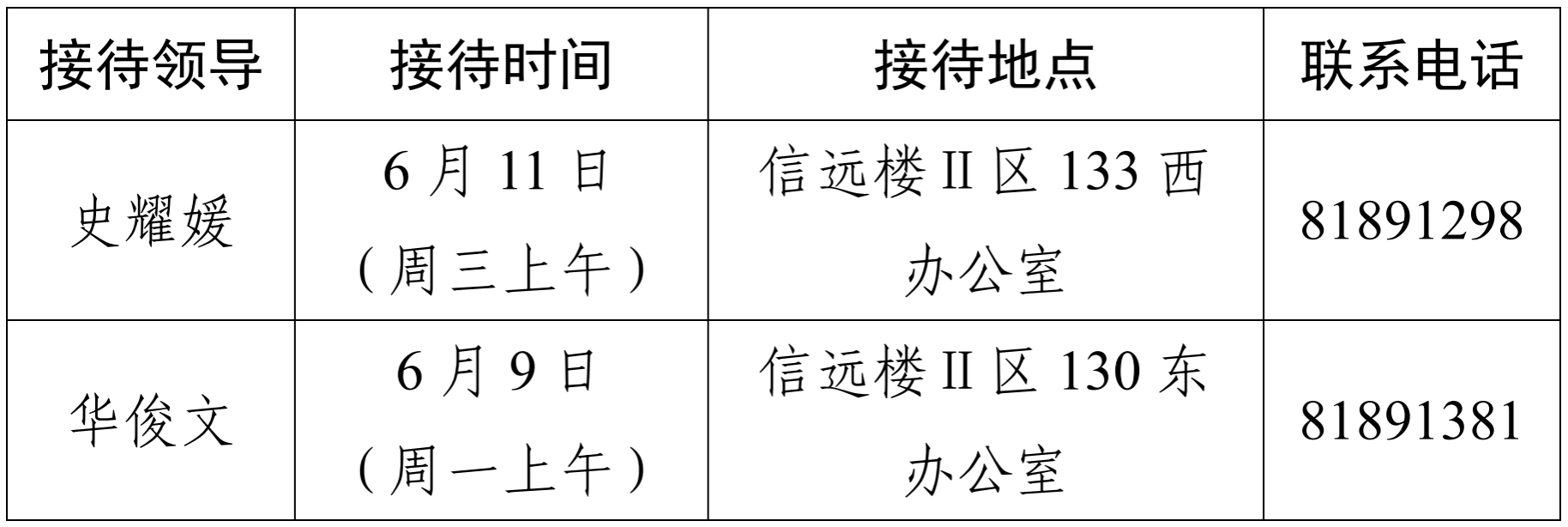 注:公司领导班子接待日主要受理的事项:1.公司人才培养、教学科研、团队建设、教师发展、对外交流、员工管理和服务保障等方面存在的问题与建议;2.反映有关公司重要决策和重要工作事宜的问题;3.涉及师生员工利益的申诉和诉求;4.亟须公司处理的难点问题;5.其他方面的建议和意见。