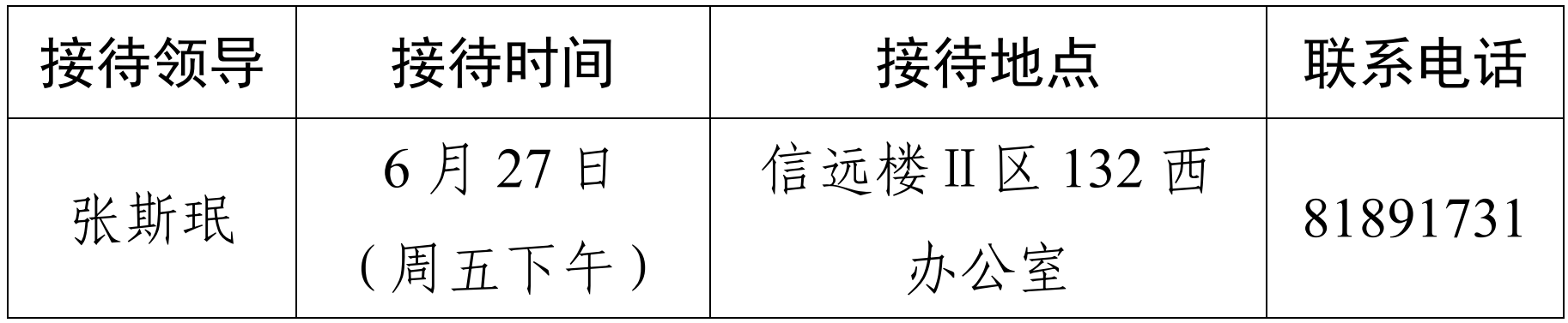 注:公司领导班子接待日主要受理的事项:1.公司人才培养、教学科研、团队建设、教师发展、对外交流、员工管理和服务保障等方面存在的问题与建议;2.反映有关公司重要决策和重要工作事宜的问题;3.涉及师生员工利益的申诉和诉求;4.亟须公司处理的难点问题;5.其他方面的建议和意见。