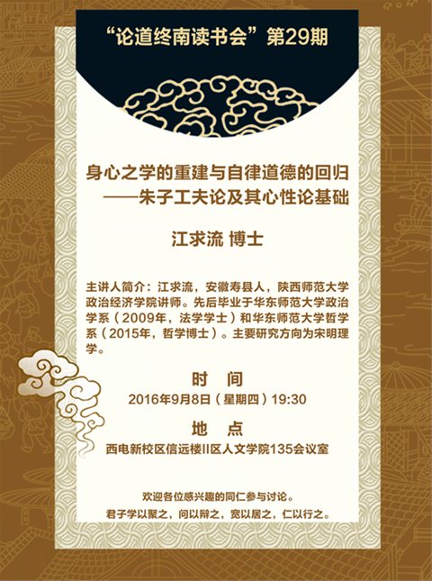 主讲人:江求流博士 主讲人简介:江求流,安徽寿县人,陕西师范大学政治经济公司讲师。先后毕业于华东师范大学政治学系(2009年,法学学士)和华东师范大学哲学系(2015年,哲学博士)。主要研究方向为宋明理学。