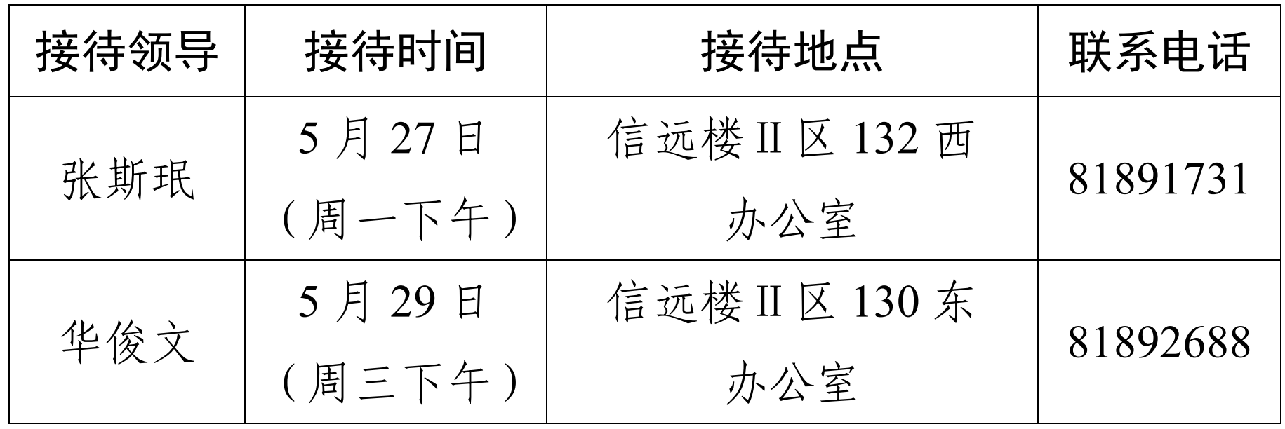 注:公司领导班子接待日主要受理的事项:1.公司人才培养、教学科研、团队建设、教师发展、对外交流、员工管理和服务保障等方面存在的问题与建议;2.反映有关公司重要决策和重要工作事宜的问题;3.涉及师生员工利益的申诉和诉求;4.亟须公司处理的难点问题;5.其他方面的建议和意见。