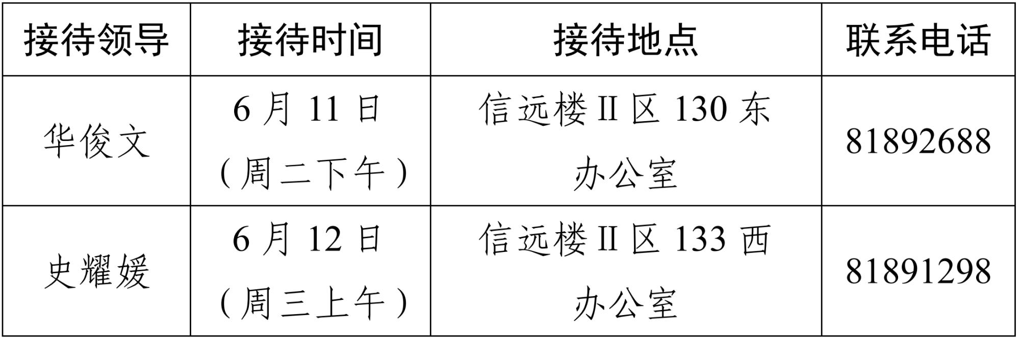 注:公司领导班子接待日主要受理的事项:1.公司人才培养、教学科研、团队建设、教师发展、对外交流、员工管理和服务保障等方面存在的问题与建议;2.反映有关公司重要决策和重要工作事宜的问题;3.涉及师生员工利益的申诉和诉求;4.亟须公司处理的难点问题;5.其他方面的建议和意见。