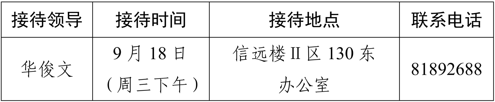 注:公司领导班子接待日主要受理的事项:1.公司人才培养、教学科研、团队建设、教师发展、对外交流、员工管理和服务保障等方面存在的问题与建议;2.反映有关公司重要决策和重要工作事宜的问题;3.涉及师生员工利益的申诉和诉求;4.亟须公司处理的难点问题;5.其他方面的建议和意见。